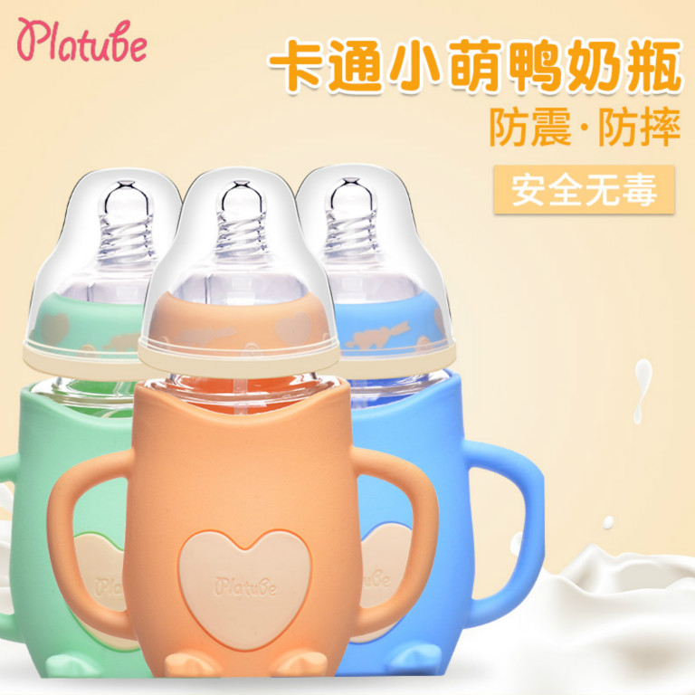 嬰幼兒玻璃奶瓶寬口徑帶手柄防摔防脹氣耐高溫 硅膠奶瓶